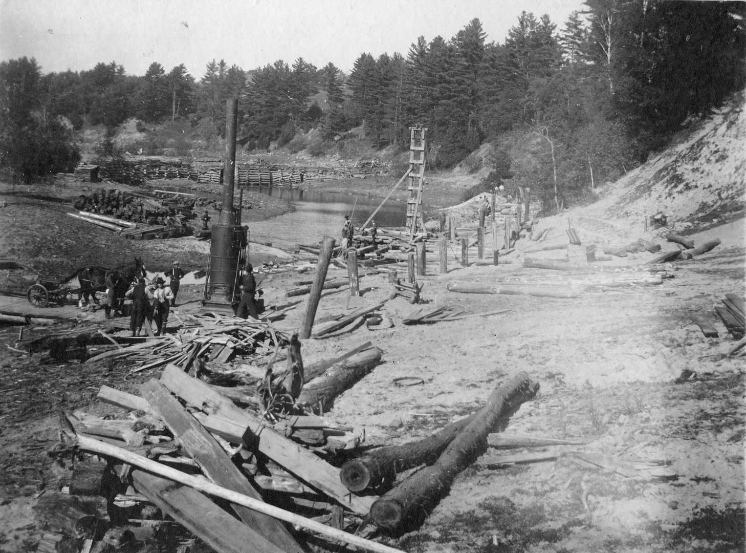 Construction d’une glissoire sur la Lièvre vers 1900.