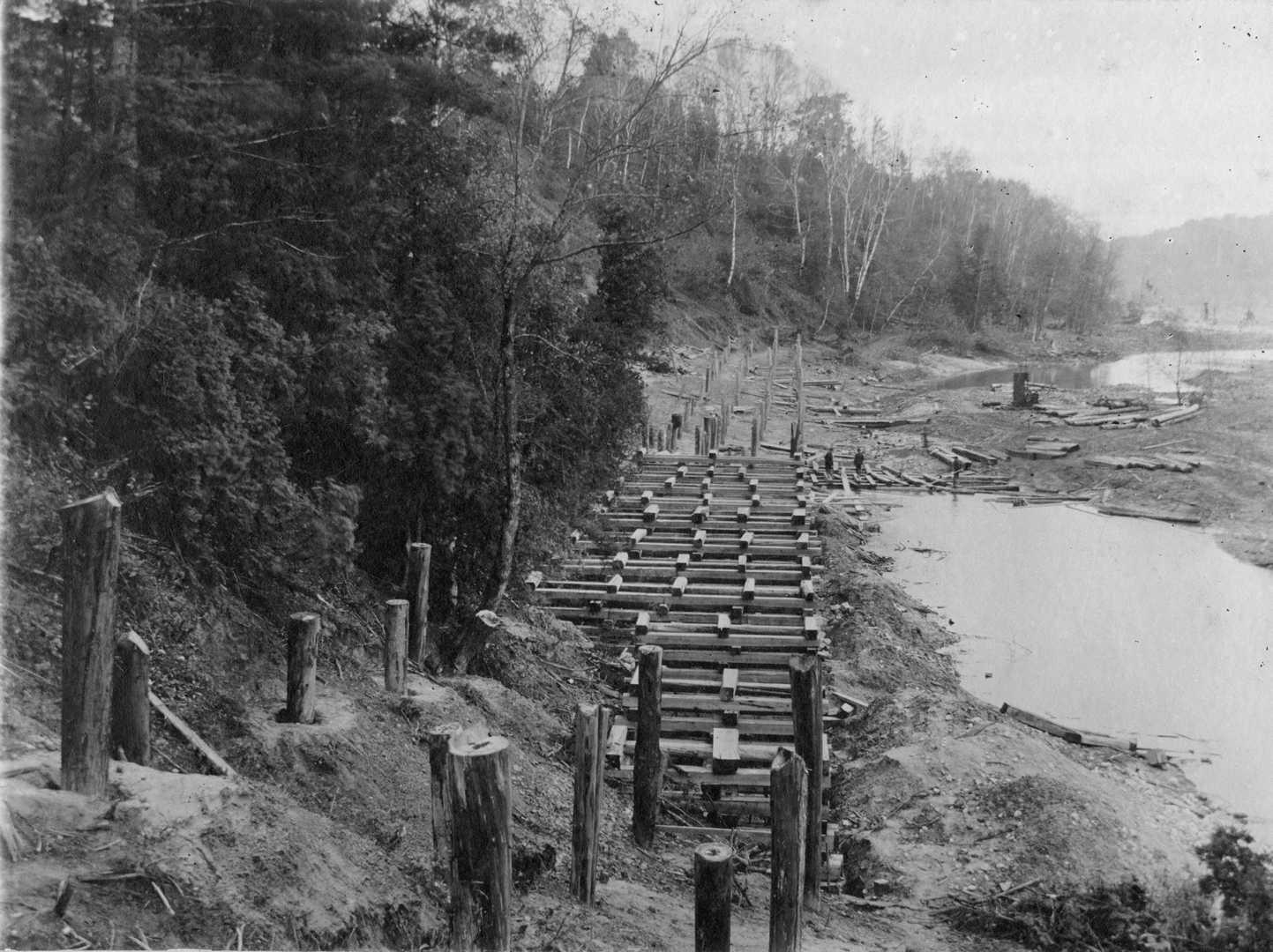 Construction d’une glissoire sur la Lièvre vers 1900.